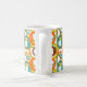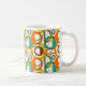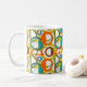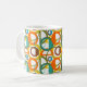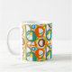 This mug has a mid-century modern design of circles and semi-circles in orange, yellow, green, brown, and turquoise on a field of white. If you want the same design with different colours, message me.
