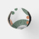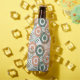 This bottle cooler has a design of circles decorated with lines and circles made of repeating dots in retro green and coral.