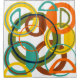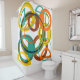 This shower curtain has a mid-century modern design of circles and semi-circles in orange, yellow, green, brown, and turquoise on a field of white. If you want the same design with different colours, message me.