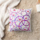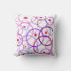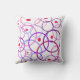 This decorative throw pillow features a whimsical geometric pattern of repeating, overlapping circles in shades of pink, blue, purple and magenta on a white background. Small red circles are scattered throughout.