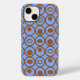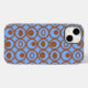 This phone case has a geometric design of circles in rows with circles or ovals inside in brown on a field of blue.
