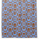 This shower curtain has a geometric design of circles in rows with circles or ovals inside in brown on a field of blue.