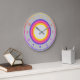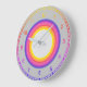 This wall clocks face is rings of colours of the rainbow as are the numbers of the clock. It is bright, cheerful and as colourful as a rainbow against a background of grey.