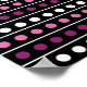 A pretty pattern made up of white, pink and purple circles and white stripes on a black background