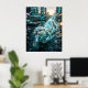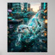 A playful circuit otter glides through a futuristic harbour stream, built from sleek waterproof plating, glowing whisker lines, and luminous streamlined contours. Cyan, silver, teal, and amber tones shimmer across its agile body as water splashes in motion. Floating docks, harbour lights, moored vessels, reflective canals, soft rain, and skyline towers create a lively urban waterscape. This charming aquatic design blends fun personality with modern technology, perfect for bedrooms, offices, kids spaces, and gifts for otter lovers.