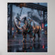 A colossal circuit rhino stands with unstoppable force in a futuristic industrial zone. Its body is built from titanium armor plating, glowing hydraulic lines, and illuminated seams that highlight massive strength and weight. Neon orange, cyan, and steel blue energy pulses through the mechanical structure while factories, pipes, cranes, steam, and wet pavement create a gritty cinematic backdrop. This bold rhino design is ideal for offices, gaming setups, modern interiors, and collectors who love power-themed futuristic wildlife.