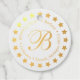 This round white paper tag showcases a beautiful gold design focused on a large, flowing script initial in the centre. A ring of custom text circles the elegant letter, giving you plenty of room to display your full name and return address. Wrapping around the very edge of the tag is a border made of classic gold five-pointed stars. A small hole is pre-punched at the top, complete with a piece of rustic brown twine threaded through, making it incredibly easy to attach this beautiful star-themed address label to your outgoing packages, party favours, or special gifts.