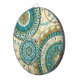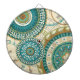 © Veronique Charron / Wild Apple. This image of circular patterns feature blue and gold colours. The image has a tan coloured, floral patterned background.