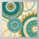 © Veronique Charron / Wild Apple. This image of circular patterns feature blue and gold colours. The image has a tan coloured, floral patterned background.