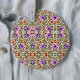 Circular pin badge with intricate floral pattern. Features purple, orange, and green flowers on a beige background. Backside shown with pin attachment.