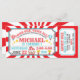 Come one, come all! Invite everyone to the greatest birthday party under the big top with our circus carnival ticket invitation templates. This circus carnival ticket birthday invitations features red circus tent background with red and teal carousel, hot air balloons and cotton candy on a modern style admit one ticket design.