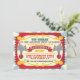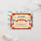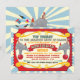 Charming Circus or Carnival Ticket Birthday Party Invitations with performing elephants and monkeys holding a banner to welcome you to the party. Shaped like a vintage ticket to a performance with a sunburst background. Hand drawn illustration by McBooboo.