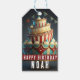 Birthday gift tags featuring a circus themed birthday cake with "Happy Birthday", all-caps bold font. Personalise it by adding your name(s).