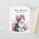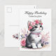 Here is a lovely kitten birthday postcard. This postcard was created for your granddaughter. The artwork features a watercolor image of a grey cat sitting among pink roses. The card is a cute way to say "Happy Birthday" to your granddaughter. It includes a greeting on the front and the back, and you can personalise either greeting. If your granddaughter loves cats, she is sure to treasure this card. (AI artwork designed by Susang6)