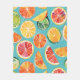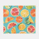 This artwork showcases a lively and refreshing pattern of citrus fruits, featuring vibrant slices of oranges, lemons, limes, and grapefruits against a bright turquoise background. The juicy, colourful fruit slices are depicted with a playful and stylised approach, capturing the essence of summertime and freshness. The use of bold, contrasting colours and the circular arrangement of the fruits create a dynamic and eye-catching composition that exudes energy and zest.