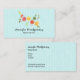 Business cardswith a cute design featuring tumbling citrus fruits - lemons, limes and grapefruits. A faint blue striped pattern in the background.