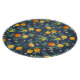 Tropical vibes with oranges, leaves, and flowers on blue.