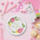 Customisable Citrus Lemon Floral Baby Shower Lemon Roses paper plates in green, pink, yellow details. Edit all text, font and colours. See complete Collection for more matching items.