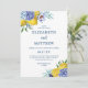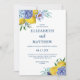 This modern lemon wedding invitation is perfect for a spring or summer wedding. This elegant design features bright and beautiful watercolor lemons with elegnat blue flowers and greenery. A yellow and white pattern decorates the back of the invitation. Designed for you by Blackberry Boulevard.
