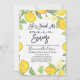 This lemon wreath bridal shower invitation features a brush calligraphy heading in black and a lemon fruit and floral wreath. The back of the invitation is a yellow watercolor wash image with a small dot pattern. This is a sweet design and a lovely way to invite guests to a bridal shower.