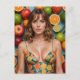 A beautiful woman in a citrus print swimsuit with a collage of fruits in the background AI generated portrait art
