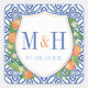 This modern classic design features a simple and elegant couples crest monogram surrounded by watercolor oranges, leaves and blossoms, with blue and white vintage tile print background.