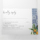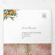 A 3 in 1 elegant wedding trifold invitation with oranges and greenery decor, and blue tiles. It includes details (accommodation and info) and rsvp postcard for your guests to cut off and send back.