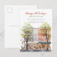This festive Christmas holiday moving announcement features the saying "Happy Holidays from Our New Place" with a beautiful watercolor city street with a big Christmas tree. The announcement is perfect for sending to friends and family during the holiday season to let them know about your new address. The front of the announcement features the saying and the watercolor snowy city street scene, and includes your new address and contact information. The overall design is festive and charming, and the announcement is sure to put a smile on the faces of your loved ones.
