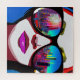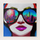 Pretty lady looking at the city through her big teal sunglasses with a reflection of the city in blue, pink and black colourful AI art. generativecontent