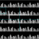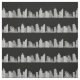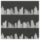 A drawing of a city skyline forms unbroken pale stripes against a black night sky. The buildings and skyscrapers are drawn in translucent white and black, so if you change the background color, the color of the city will change to complement it. This would be a good pattern for quilting, masks, and other craft projects. The city could be cut into strips for borders.