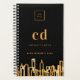 A black background, with a modern, abstract faux gold city skyline as decor. Personalise and add your business logo, monogram letters, name and a title. Golden letters. Your company logo both on front and on the back.