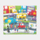 Artist: Marcus Cutler | illustration of a busy city street and bus stop with pedestrians and cars, trucks and shops and a boy on a bike