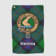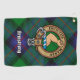 Clan Armstrong crest badge surrounded by a strap and buckle over tartan background. Custom text.