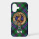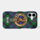 Clan Baird crest badge surrounded by a strap and buckle over tartan background. Custom text.