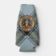 Clan Bell crest badge surrounded by a strap and buckle over tartan background. Custom text.