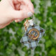 Clan Bell crest badge surrounded by a strap and buckle over tartan background. Custom text on both sides.