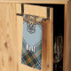 Clan Bell crest badge surrounded by a strap and buckle over tartan background. Custom text.