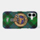 Clan Blair crest badge surrounded by a strap and buckle over tartan background. Custom text.
