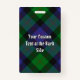 Clan Blair crest badge surrounded by a strap and buckle over tartan background. Custom text.