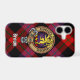 Clan Brown crest badge surrounded by a strap and buckle over tartan background. Custom text.