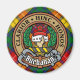 Clan Buchanan crest badge surrounded by a strap and buckle over tartan background. Custom text.
