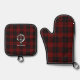 Stylish kitchen potholder set features Scottish Clan Cameron crest badge and customisable text on tartan background.