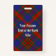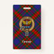 Clan Carnegie crest badge surrounded by a strap and buckle over tartan background. Custom text.