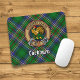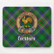 Clan Cockburn crest badge surrounded by a strap and buckle over tartan background. Custom text.