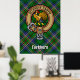 Clan Cockburn crest badge surrounded by a strap and buckle over tartan background. Custom text.