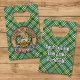 Clan Currie lion crest badge surrounded by a strap and buckle over tartan background. Custom text on both sides.