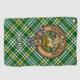 Clan Currie lion crest badge surrounded by a strap and buckle over tartan background. Custom text.