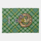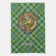 Clan Currie lion crest badge surrounded by a strap and buckle over tartan background. Custom text.