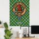 Clan Currie rooster crest badge surrounded by a strap and buckle over tartan background. Custom text.