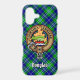Clan Douglas crest badge surrounded by a strap and buckle over tartan background. Custom text.
